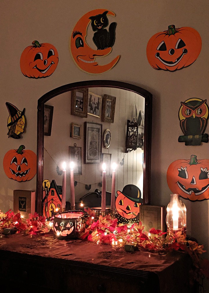 This is one of my favorite styles! Vintage inspired Halloween decor is definitely trending in 2025. To get that creepy but cozy feel, go crazy with hanging paper cutouts, light up pumpkins, and spooky figurines. Complete the look with warm lighting and candlesticks (thankfully we have flameless options now). Try browsing some thrift stores for authentic vintage decor!