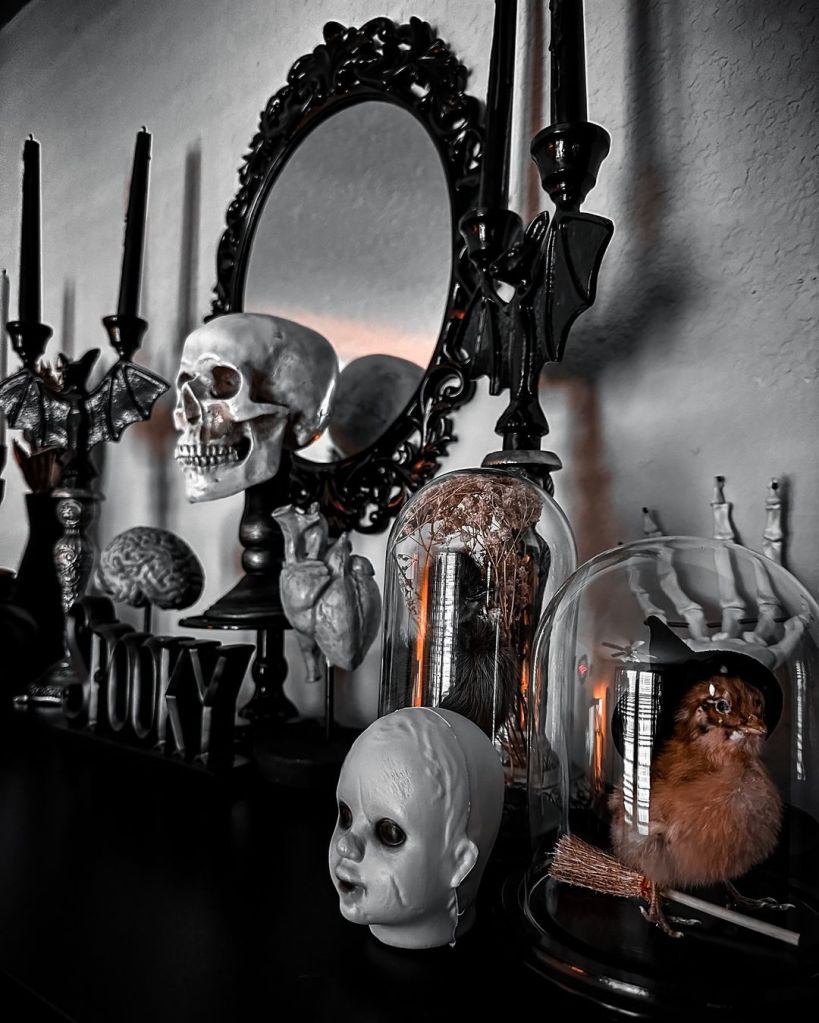 Another one of my favorites! The Wednesday Addams look is spooky and eclectic and pulls from Victorian Gothic and classic horror styles. Think skulls, bats, intricate designs, strange trinkets, and, of course, black. Mirrors, ghostly pictures, and a pop of ominous purple lighting bring the Wednesday vibe all together.